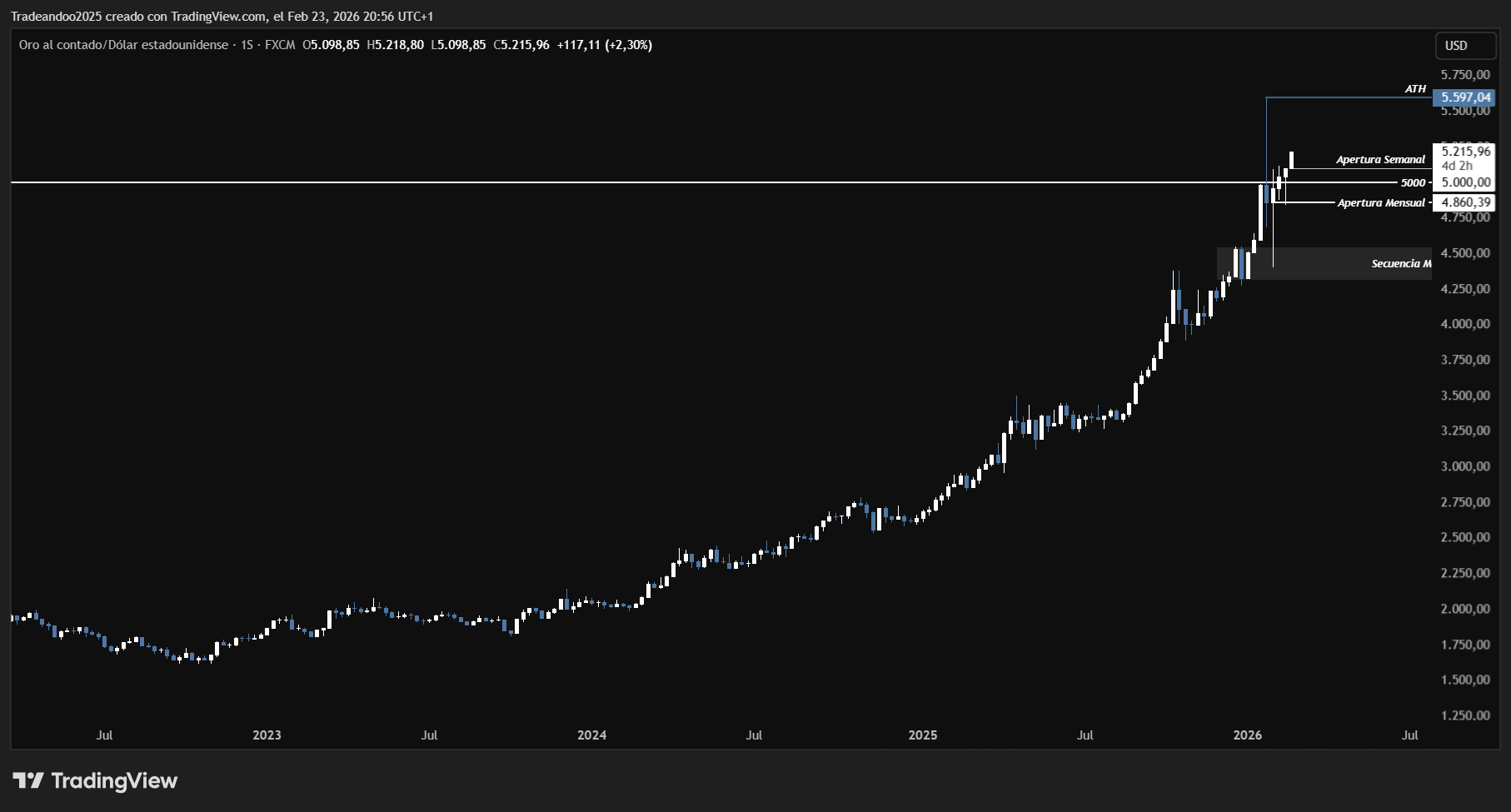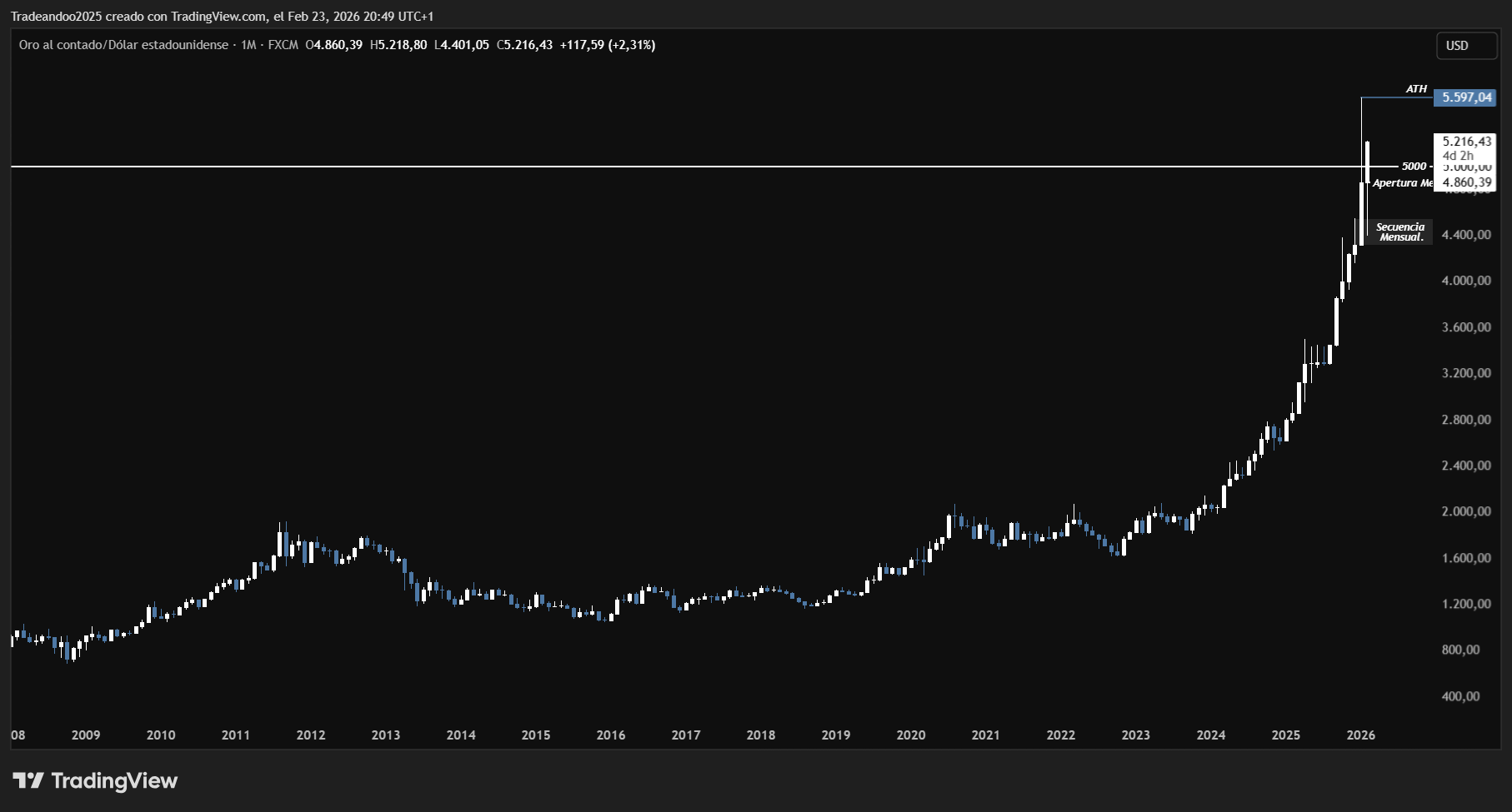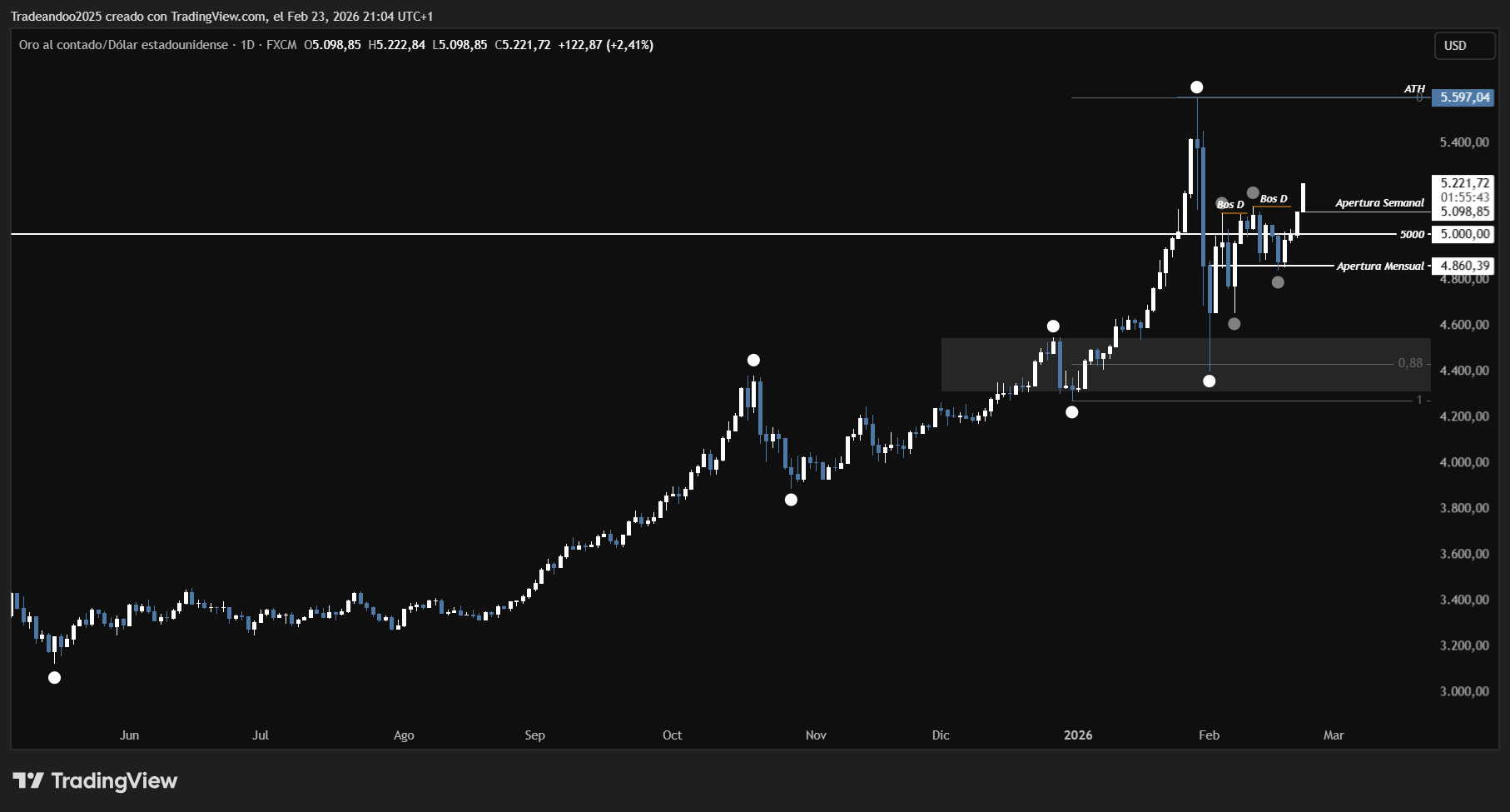 Actualmente el precio se mantiene por encima de la apertura mensual ubicada en 4.860 y, además, consolidado sobre el nivel psicológico de 5.000. Este comportamiento refuerza la fortaleza del impulso vigente y muestra aceptación en zonas de precios superiores.