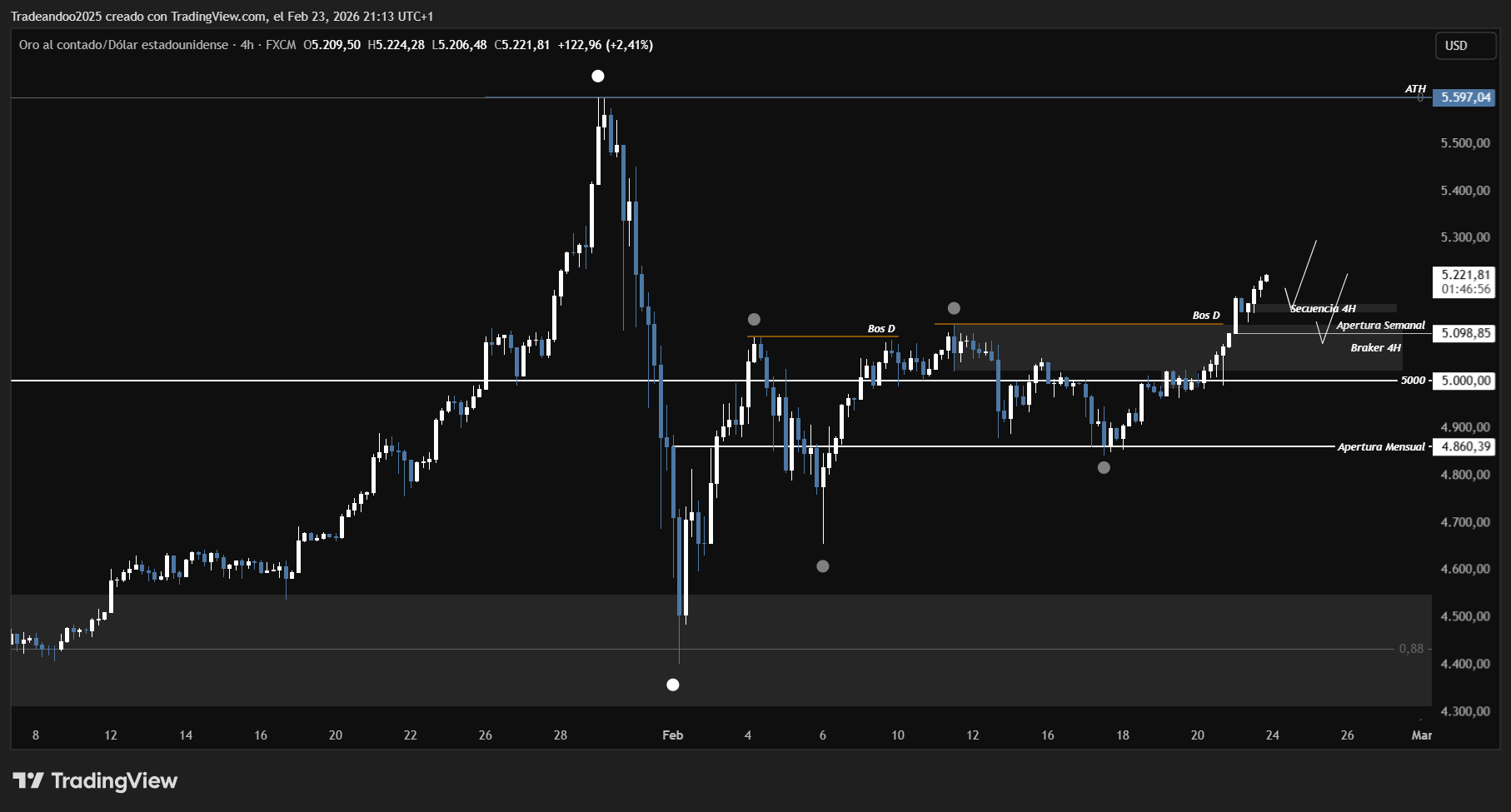 Al día de hoy, lunes 23/02/2026, a falta de dos horas para el cierre de la vela diaria, el precio se encuentra confirmando un nuevo BOS (Break of Structure) alcista, lo que refuerza la continuidad del movimiento y valida la dominancia compradora en el corto plazo.